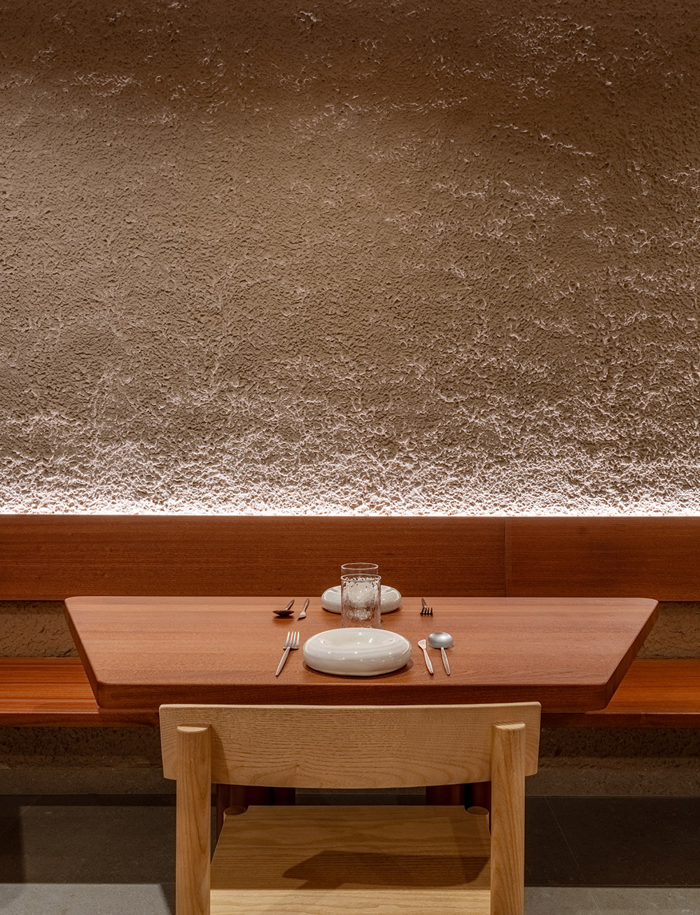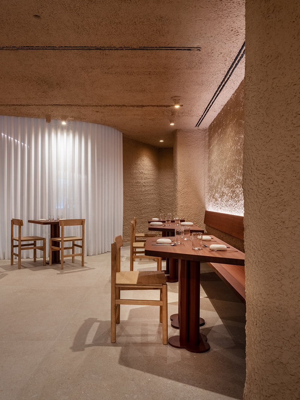 La cocina abierta recibe al comensal con una barra japonesa en forma serpenteante, que avanza y retrocede para invitar al diálogo entre clientes y cocinero. Aquí, el concepto de “ver sin ser visto” se materializa en una barra de tres alturas combinando madera, microcemento y acero.