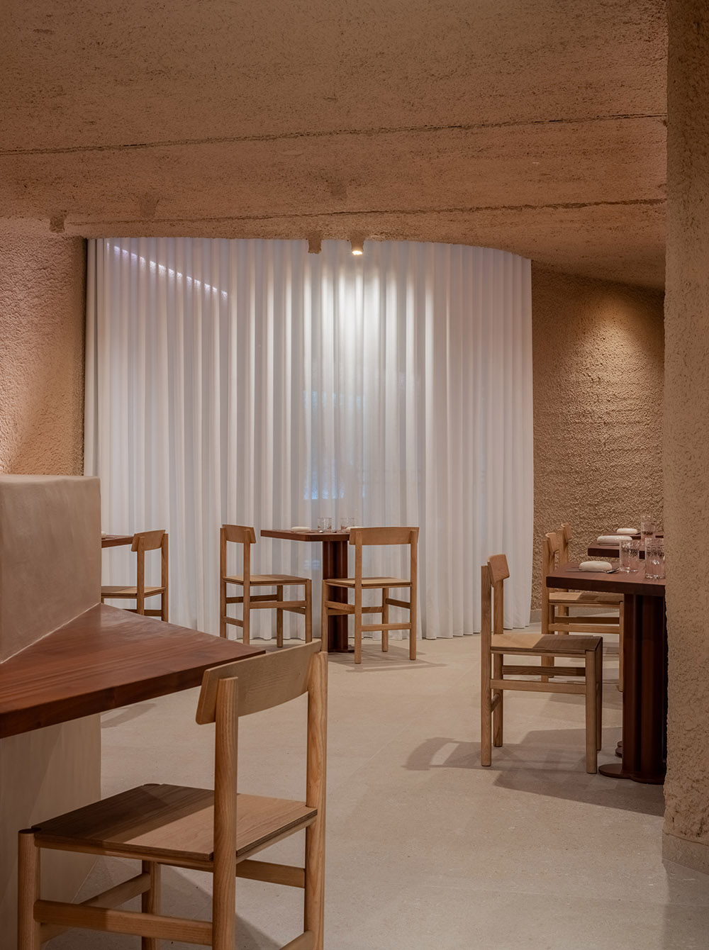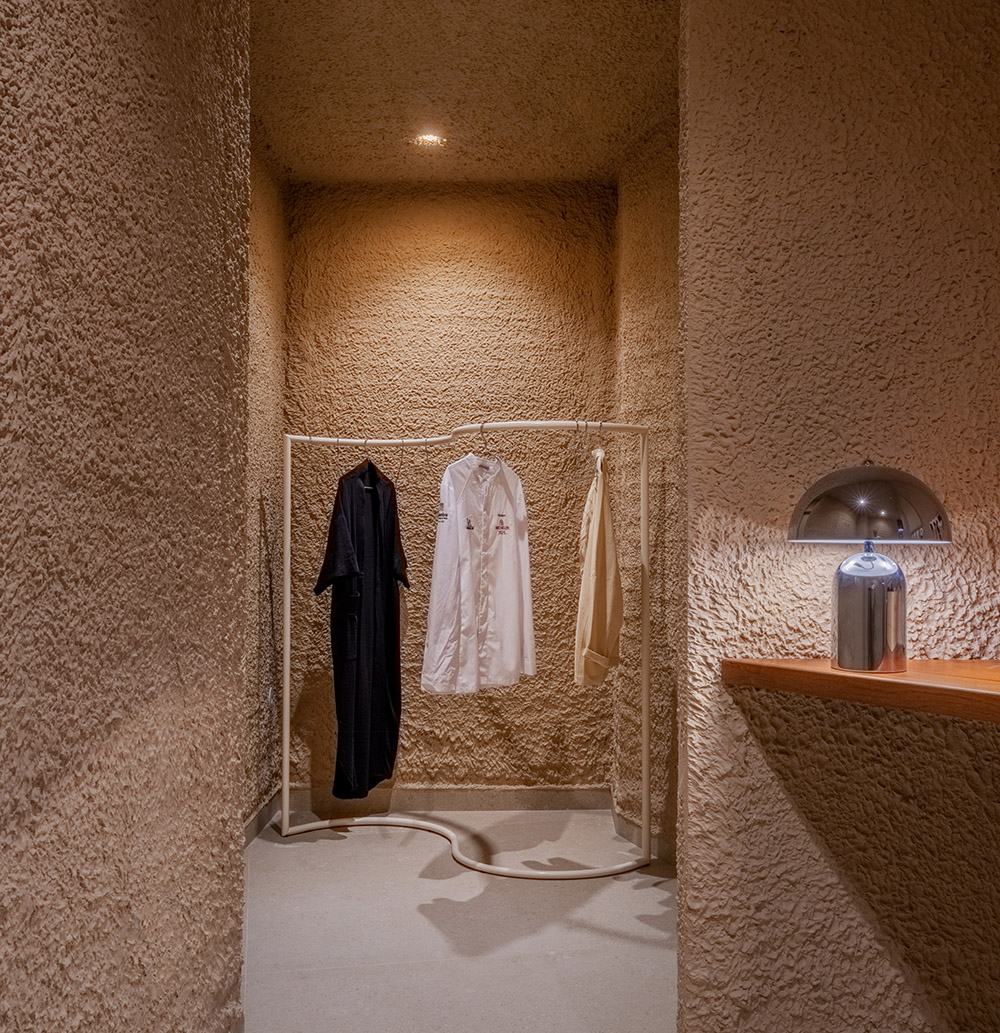 El yeso proyectado en tono marrón suave remite a las murallas descarnadas de cal. La iluminación tenue y cálida recuerda a la de las musealizaciones, transportándonos a una medina nocturna iluminada por farolillos y lámparas de aceite. La madera oscura aporta un matiz exótico y, al trabajarse en tablas, evoca la construcción en tapial de murallas y torres. Las formas orgánicas y curvilíneas rememoran las calles y trazados intrincados de las antiguas medinas árabes.